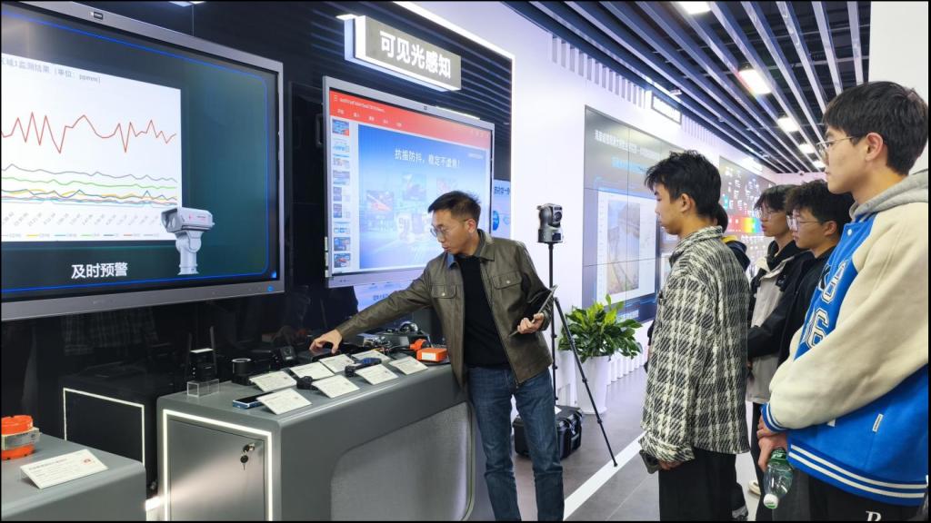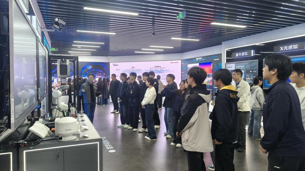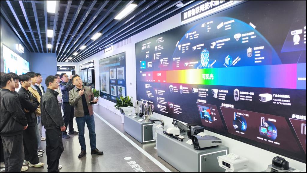 抵达园区后,师生们在工作人员的引导下有序步入企业核心展厅。展厅内陈列着智能安防终端、物联网系统、人工智能应用方案等一系列前沿科技成果,呈现出一幅生动的科技图景。工作人员聚焦于一款智能摄像机,深入浅出地阐释了其核心的多光谱融合技术:“该技术能同时捕捉可见光、红外等多种信号,从而实现全天候的环境感知。”通过现场演示与真实案例的结合,抽象的技术原理被转化为直观的应用场景,专业知识的呈现方式变得更加鲜活。学生们在参观过程中不时驻足观察、低声交流,科技的好奇心与探索欲在亲身体验中被充分激发。