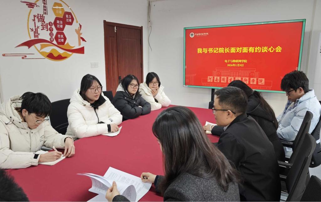 1月9日,电子与物联网学院在“一站式”学生社区党建活动室召开“我与书记院长面对面”谈心会。学院党总支副书记刘竹、副院长孙雷明,以及辅导员代表、2024级和2025级学生代表齐聚一堂,围绕学业发展、校园生活、未来规划等议题展开坦诚交流,共话成长困惑,畅谈未来发展愿景。
