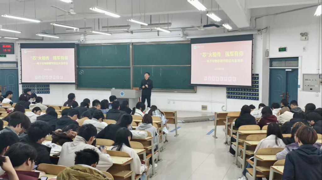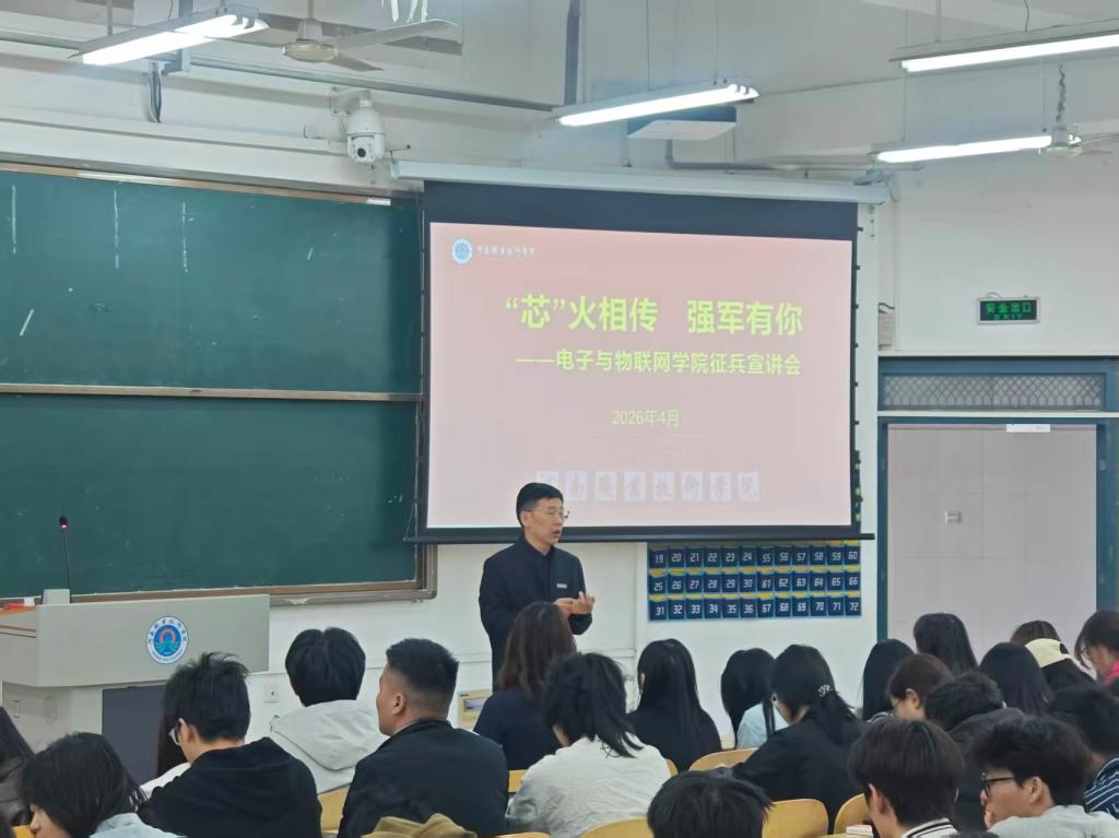 4月9日至10日,电子与物联网学院在1101教室举办“‘芯’火相传 强军有你”征兵政策专题宣讲会。本次宣讲会由学院党总支书记谭营军主讲,学院2024级、2025级全体学生参加活动。